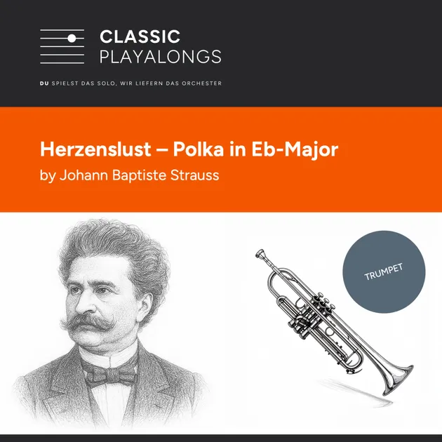 Herzenslust von Johann Baptist Strauss (Sohn) in Es-Dur für Trompete Orchester-Playalong mit Noten als Download (mp3 und pdf).